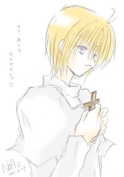 さくらいのあサマからリクエストで頂きましたv「ふわふわの三蔵」です… のあしゃんの八戒・三蔵と出逢うことがなかったら、今頃こんなことはしていないハズなわたくし (だって、のあしゃんがぶたぼリンク作ったからこのサイト作ったんだもんv) きりきりっと切ない小説だけでなく、イラストがまたこの柔らかさ 「なんて罪作りな…」と、何度思ったことやらですよ(笑)いや、マジで! のあしゃんの「シンカロン」で、トップ絵だった天使八戒とお揃い(!)の神父三蔵です…vvv ファ、ファン心理を心得てらっしゃる…下僕状態のわたくしです |